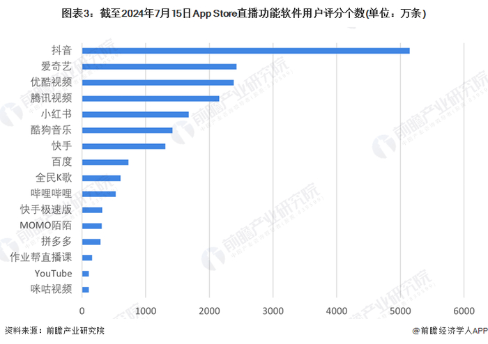 除了主营直播软件外,进一步调研具有直播功能的App应用下载的数据,用户评分个数如下图3排列所示,我们发现抖音处于绝对头部位置,紧随其后的是爱奇艺、优酷、腾讯视频三个视频播放软件,可见网络视频对网络用户巨大的吸引力,再转化为直播流量的巨大应用潜力。