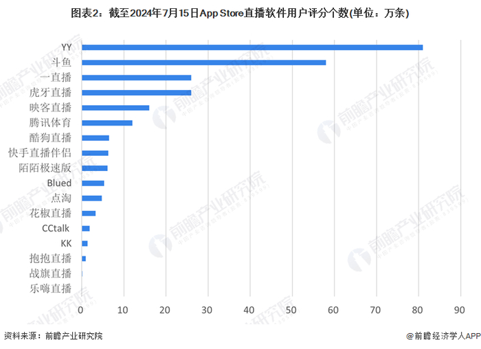 由于网络直播行业主体以平台形式呈现,在不同场景下与特定内容结合,形成“直播+”的模式,衡量不同企业在网络直播市场中所占据的地位,我们通过苹果App Store中,对软件用户的评分个数来判断,既能表示直播软件的用户规模大小,又能反映用户黏性。可以发现YY直播和斗鱼直播累计评论数最多,且明显领先于后面的直播软件,表明二者在下游市场中的较高地位。