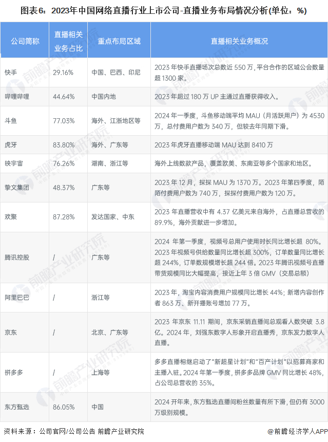 网络直播行业的上市公司中,快手、欢聚的直播业务布局最广,着手开拓海外市场,其他上市企业大都重点布局在国内,尤其是北京、长三角、珠三角地区。其中,斗鱼和虎牙在2023年面临着营业收入减少,活跃用户流失的不利局面,也转向扩展国际业务。