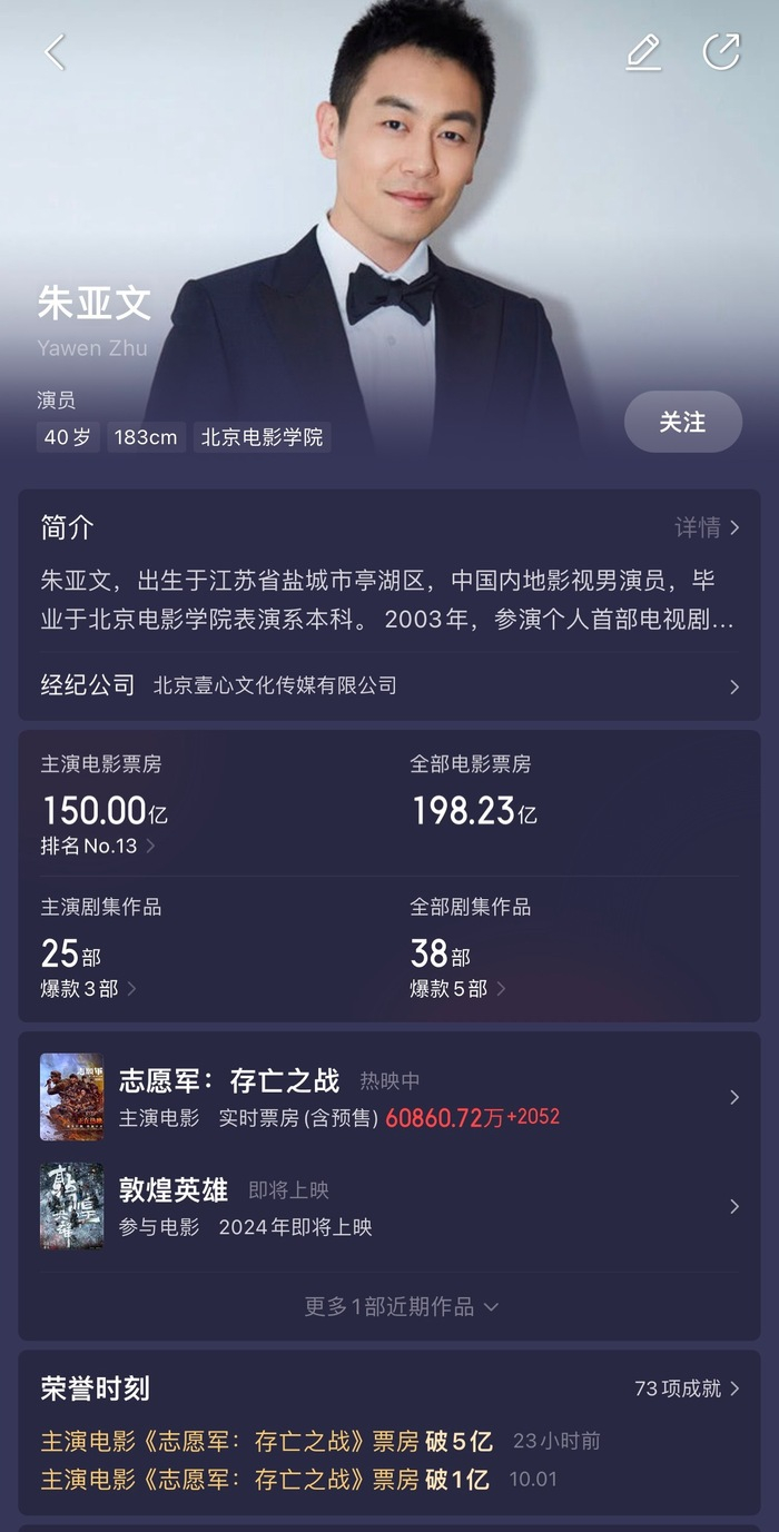 据猫眼专业版数据,朱亚文主演电影《志愿军:存亡之战》正在上映,其主演电影累计票房突破150亿元。