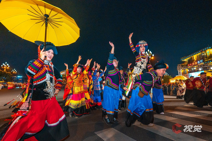 10月2日,国庆非遗巡游活动在峨眉山举行,超500人的巡游队伍浩浩荡荡为市民奉献了一场精彩的非遗巡演盛宴。图为彝族三雄夺魁表演。