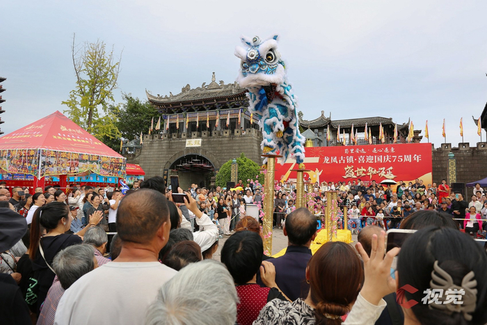 10月2日,遂宁市龙凤古镇精彩的舞狮子表演展现了中华文化的魅力,营造出浓厚的节日氛围。