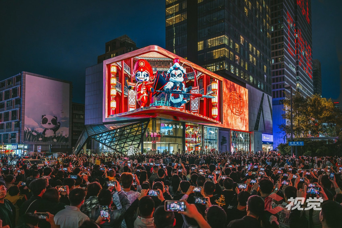 10月3日晚,春熙路熙熙攘攘人流如织,许多游客慕名前来,打卡网红景点裸眼3D大屏。