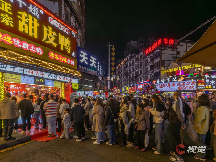 10月3日,来自各地的游客在乐山张公桥美食街排队购买当地特色甜皮鸭。