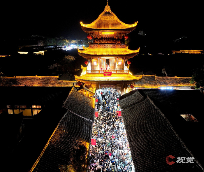 10月3日晚,四川阆中古城中天楼民俗表演“绣球招亲″,吸引众多游客和市民互动观赏。