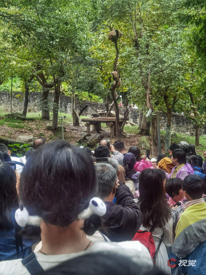 10月4日,中国大熊猫保护研究中心都江堰基地,游客正在参观树上卖萌的熊猫。