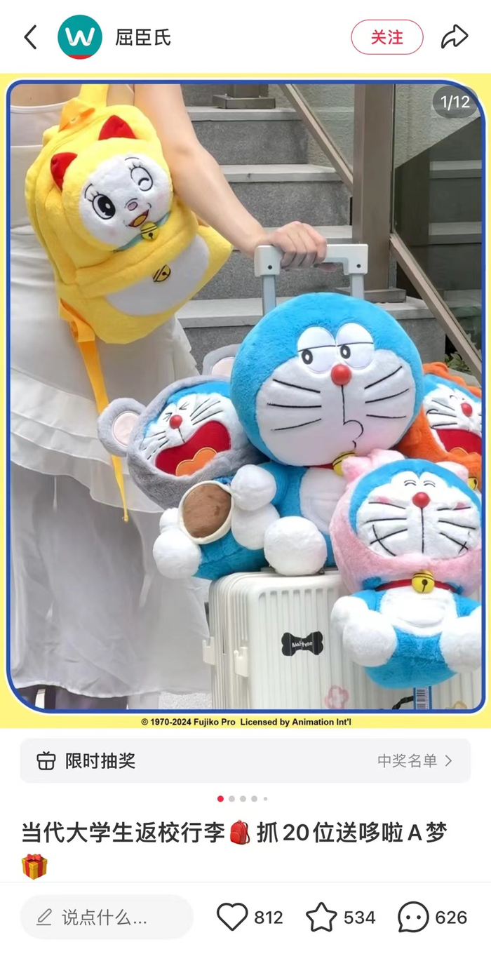 此外,越来越多线下零售集合店也开始进行IP联名。这虽然不算是新趋势,但“吃谷热”正在卷入更多潮玩之外的线下零售品牌,8月屈臣氏与哆啦A梦联名合作,并推出了水杯、公仔、化妆包、手提包、颈枕等多款周边,激起了很多网友的童年记忆和购买欲。