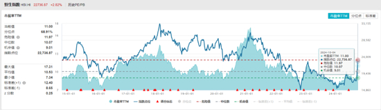 数据显示,恒生指数最新市盈率(PE)为11倍,略高于过去10年10.07倍的估值中位数,不及危险值11.97倍。恒生科技指数最新PE为29倍,不及过去10年36.11倍的中位数以及危险值的44.35倍。