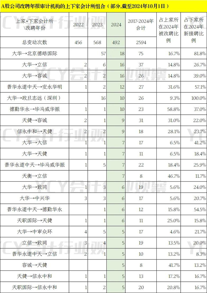 在2024年A股公司改聘审计机构的上家下家审计机构组合有227种,其中出现过5次及以上的清单如下表。出现最多的是从大华会计所改聘北京徳皓国际会计所(原北京大华国际会计所),前者16.7%的改聘客户改聘了后者,后者81.8%的新聘客户是从前者改聘而来。