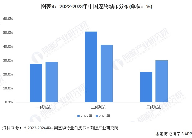 从宠物城市分布来看,2023年宠物主仍主要分布二线城市,占比41.1%,一线城市、三线及以下城市宠主较2022年均有所上升,其中一线城市宠主占比为28.9%,三线及以下城市占比为30%。