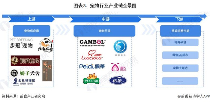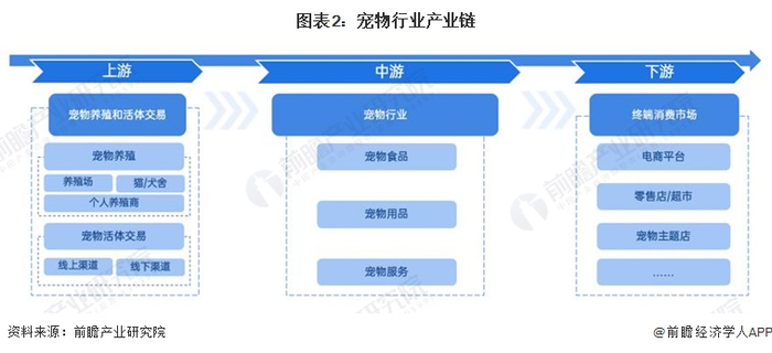 从产业链角度出发,宠物行业可分为上游的宠物繁殖和宠物交易;中游的主要为宠物食品、用品和宠物服务供应企业;下游主要宠物终端消费市场及其相关环节,包括宠物主(即最终消费者)以及他们与宠物相关的一切消费场景,如通过线上或线下渠道购买宠物食品、用品,以及为宠物选择和使用各种服务。