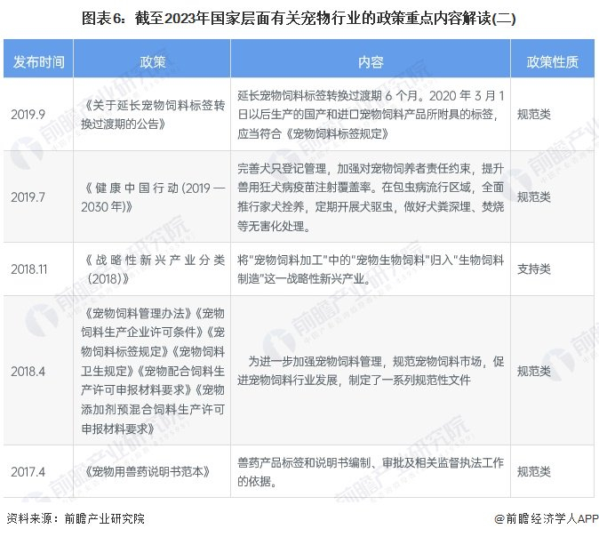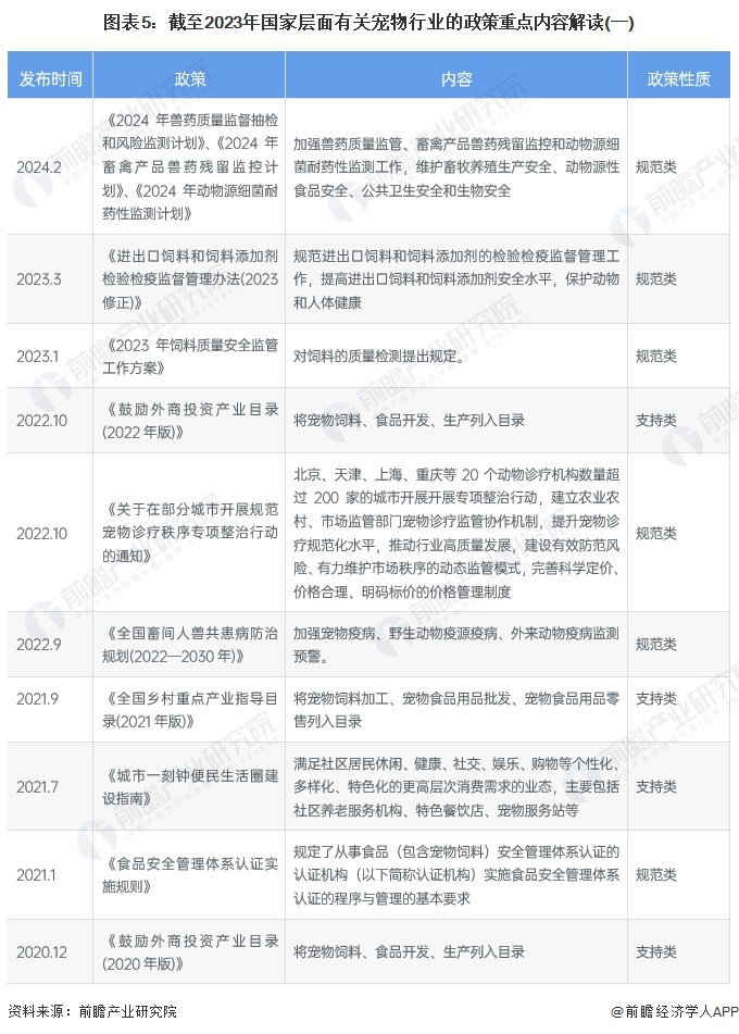 近年来我国宠物行业相关政策主要包括宠物药物、食品以及宠物进出口等,主要旨在加强宠物行业主要细分市场的监管,包括兽药质量监管、宠物诊疗、饲料及饲料添加剂管理等,以推动宠物行业健康、有序、高质量发展。