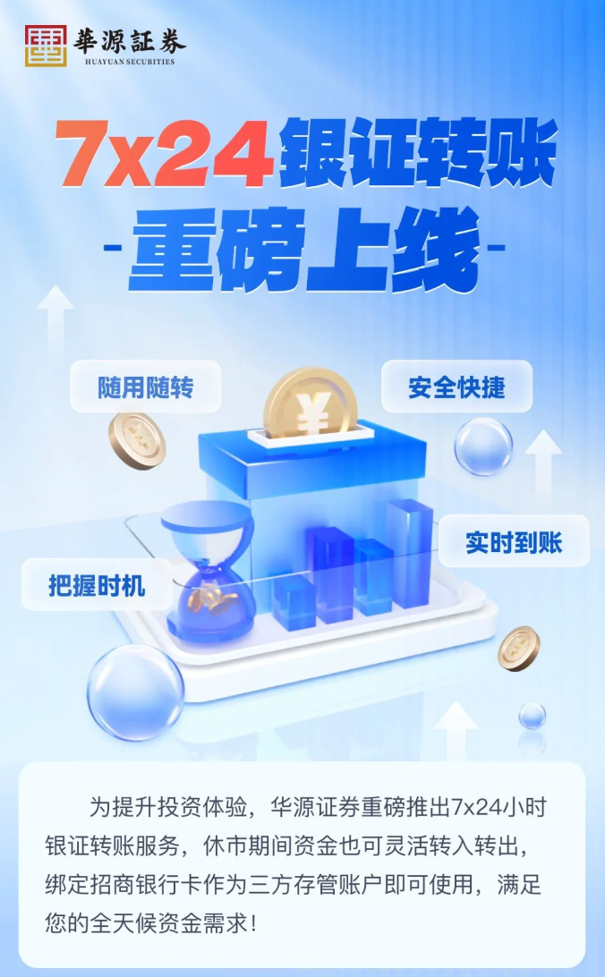 因此,在这个国庆假期,除了推出“7×24小时开户”外,也有券商打出“7×24小时银证转账”的口号。休市期间,资金也可灵活转入转出,满足投资者全天候资金需求。