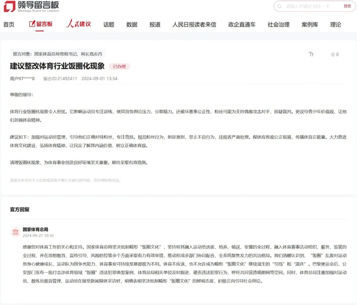 9月1日,有网友在人民网领导留言板向国家体育总局留言称,“体育行业饭圈化现象令人担忧。它影响运动员专注训练,使其背负舆论压力,分散精力。还破坏赛事公正性,粉丝可能为支持偶像攻击对手、质疑裁判。更误导青少年价值观,让他们忽视体育精神。”