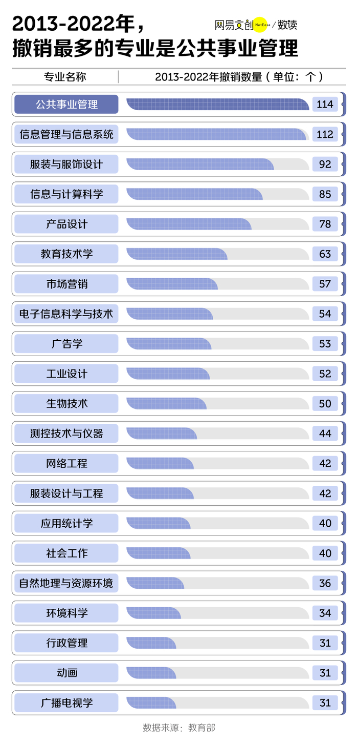 至于撤销最多的专业,近十年来,主要是从属管理学门类下的公共事业管理、信息管理与信息系统,数量分别为 114 个和 112 个。