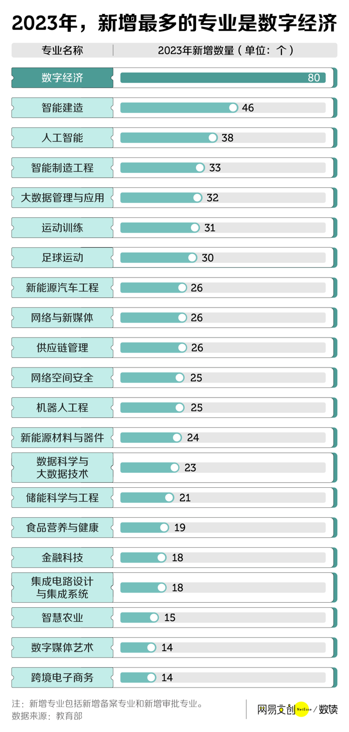 以 2023 年为例,新增数量最多的专业并非眼下最热,隔三岔五“一夜之间颠覆世界”的人工智能,而是数字经济,增设该专业的院校有 80 所,远超第二名智能建造专业的 46 所和人工智能专业的 38 所。