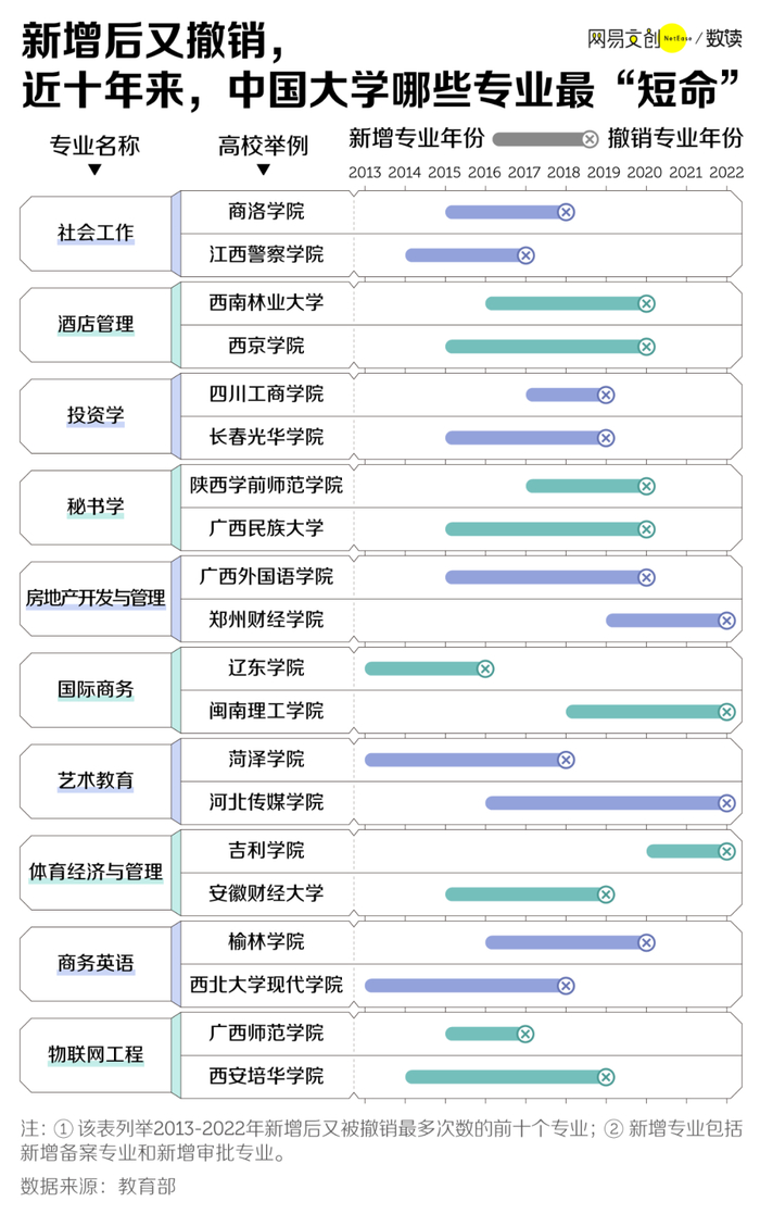我们统计了 2013-2022 年十年间各高校新增后又撤销的专业,发现最常见的“短命专业”前五名分别是社会工作、酒店管理、投资学、秘书学和房地产开发与管理。