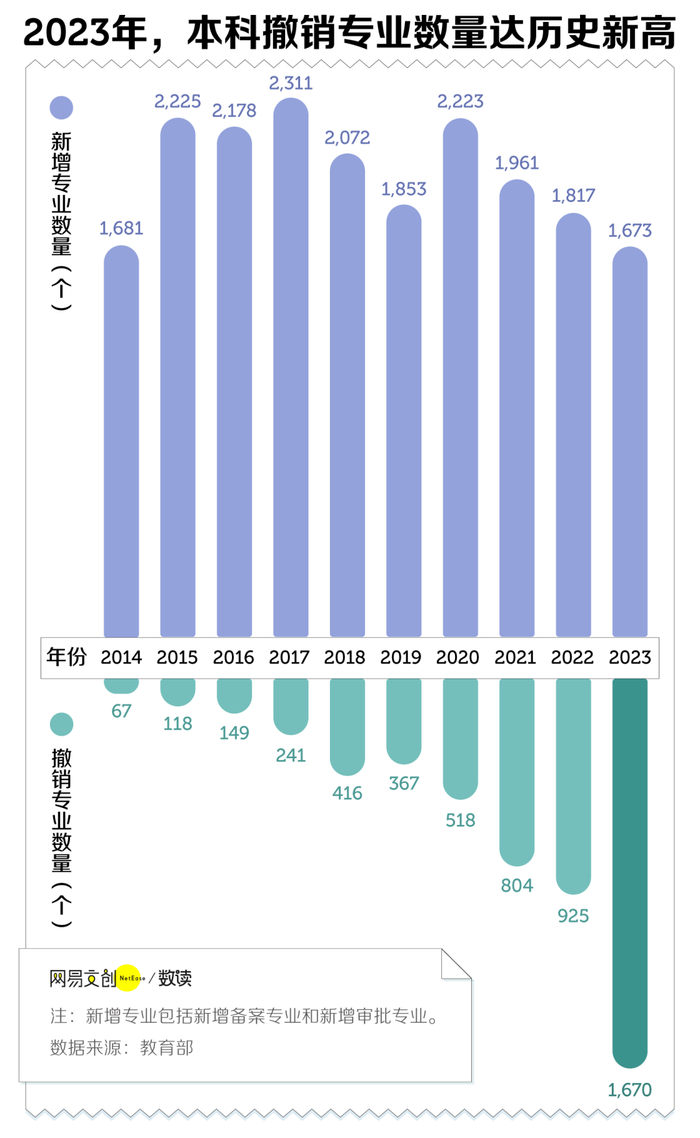 今年三月,教育部公布 2023 年度普通高等学校本科专业备案和审批结果,显示本科招生要撤销 1670 个专业,数量更是创历史之最 [2]。