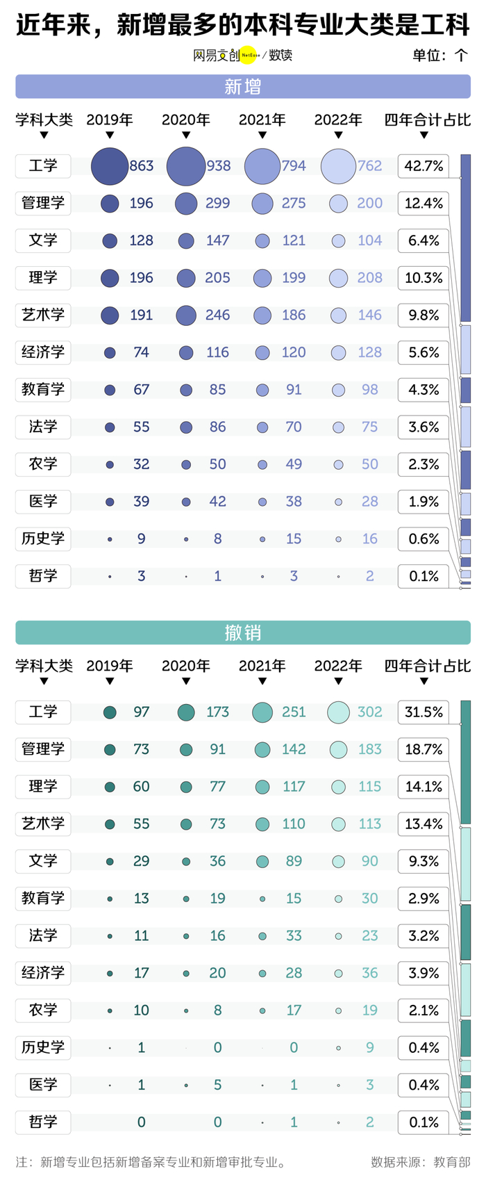 相比之下,农学、医学、历史学和哲学就佛系多了,无论是新增还是撤销,占比变化都不大。历史学、医学和哲学在 2019-2022 年的撤销数量,更是少到仅个位数。