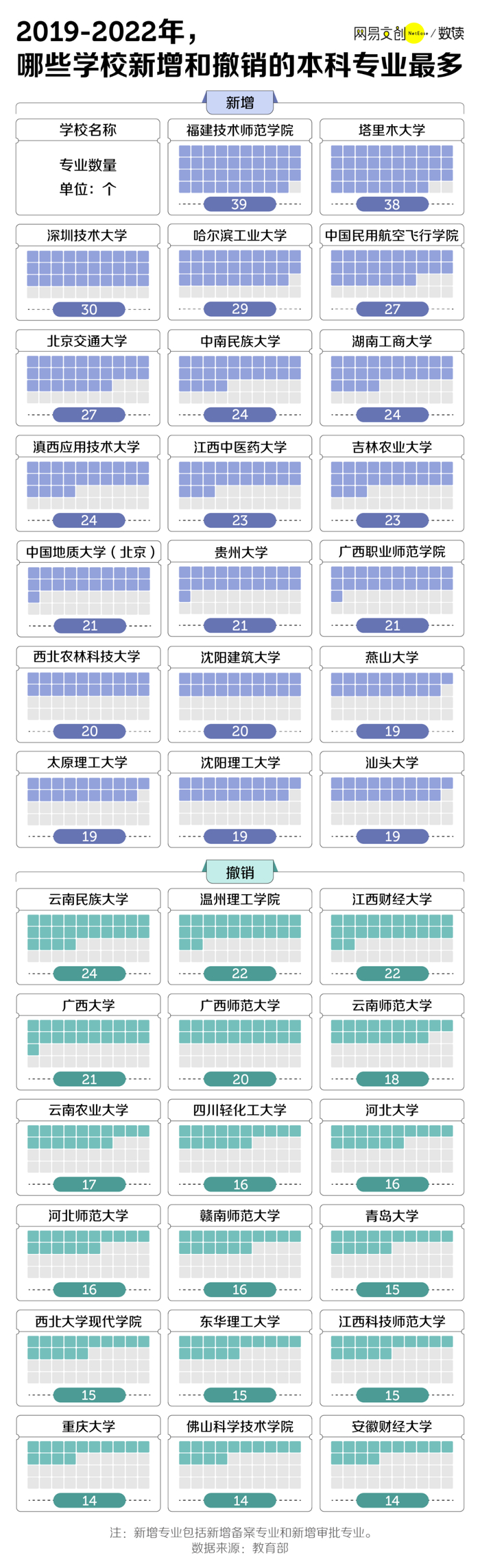 其中高校本科新增专业数量相对平稳,每年在 2000 个上下浮动。但同时,撤销专业的数量自 2020 年来屡创新高。
