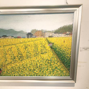 艺术中心二楼的墙上有一幅油画,名为《油菜花》,作者是秦华丽,也是这里的保洁阿姨。