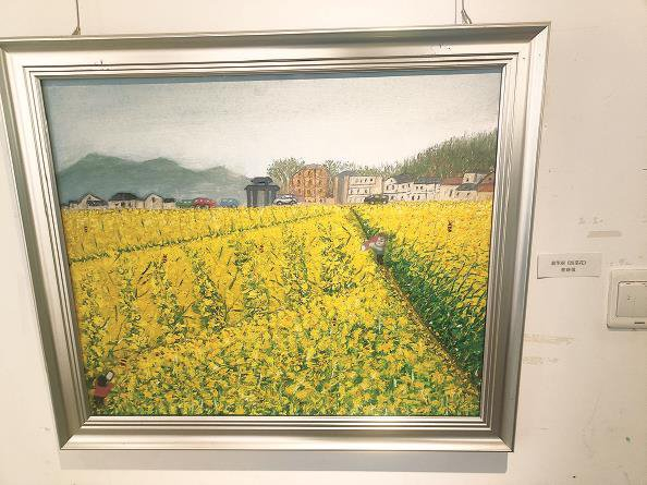 2014年,秦华丽来到曹路,负责金海文化艺术中心2楼的清扫工作。恰好,油画教室也在2楼,她有意无意间边拖地边听老师讲课,看学员们画画,“偷学”到了很多绘画技巧,也渐渐对绘画产生了兴趣。她看到别人丢弃的画笔、颜料和画纸觉得很可惜,就把它们收集起来,下班后,她一个人坐在教室里对着雕塑也描上几笔。她喜欢画自己的家乡,有金灿灿的油菜花,有刚刚露头的秧苗,有颗颗饱满的稻穗,也有丰收喜悦的农民……如今,她白天在艺术中心认真工作,下班后会举起画笔勾勒家乡美景。