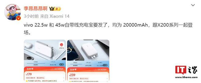博主 @李昂昂昂啊 今日发文称 vivo 22.5W 和 45W 自带线充电宝会跟 X200 系列手机一起登场,两款充电宝的电池容量均为 20000mAh。