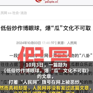 10月5日晚,北京市公安局通州分局通报:近日,网传一篇题为《低俗炒作博眼球,曝"瓜"文化不可取》的文章引发社会关注。经核实,此文章系不法人员假冒人民网名义杜撰并上传网络,造成恶劣社会影响。目前,公安机关已立案侦查,将依法对相关违法人员严厉打击,切实维护网络秩序,保障新闻媒体权益和群众利益。