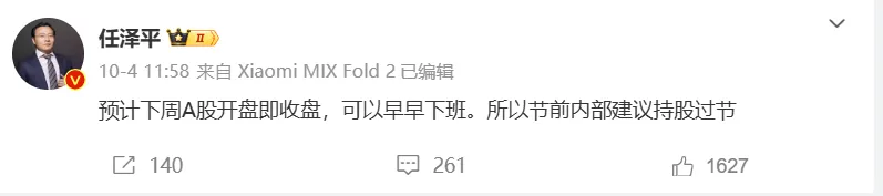 10月4日,经济学家任泽平发文称,预计下周A股开盘即收盘,可以早早下班,所以节前内部建议持股过节。