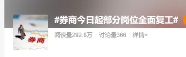 有媒体报道,10月6日起部分券商岗位已全面复工,集中在财富、经纪条线,包括券商召开开市前动员大会,分管领导及分支机构负责人需要到位安排部署工作,核心安排在于开户、交易等事项。