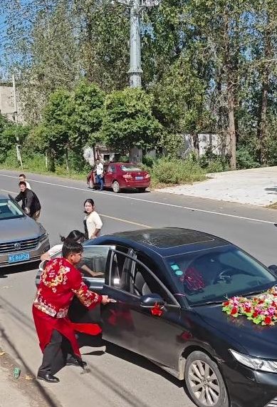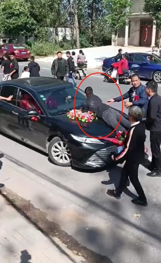 这件事最初引发关注源于网友在短视频平台发布相关视频。视频显示,在一个结婚接亲现场,新郎先是将新娘从娘家房屋拉出,穿过人群带到车上,并指示司机开车,但很快有一名疑似新娘的男性家属跟了上来,直接趴到车辆引擎盖上,阻碍车辆前行,旁边一直有人来劝阻未果。