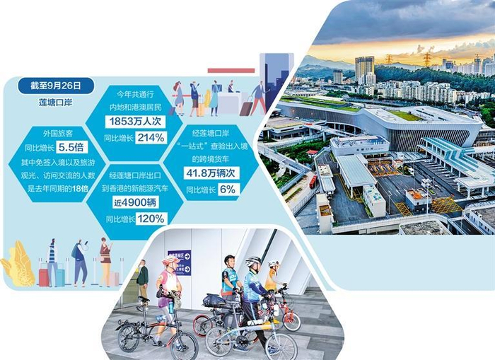 今年以来,莲塘口岸已经开通河源、梅州等地往返香港机场、迪士尼共14条粤港联程联运线路。通关措施持续便利,交通路网不断丰富,吸引着越来越多民众在口岸边安家生活、往返两地工作求学,大湾区“1小时生活圈”正从发展愿景成为生活现实。据深圳边检总站统计,截至9月26日,莲塘口岸今年共通行内地和港澳居民1853万人次,同比增长214%,占总客流的99%;通行出入境车辆81万辆次,是去年同期的1.6倍。