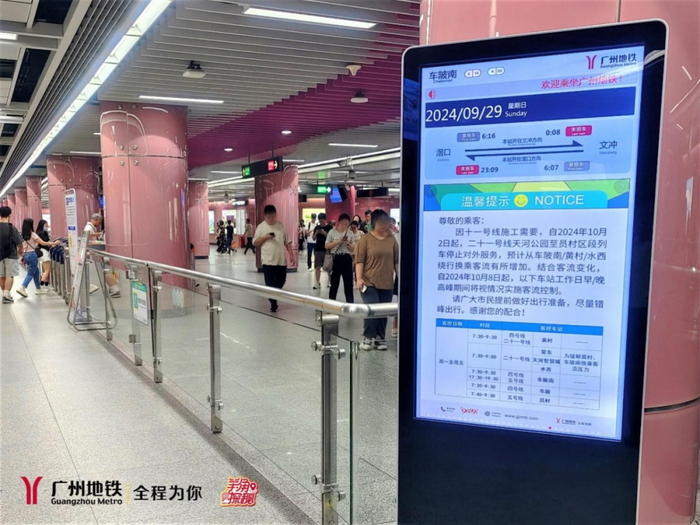 车陂南站是四号线、五号线唯一换乘站,受员村至天河公园站区段拆解影响,客运压力会有一定增大。车站将视现场客流情况采取加大运能投放、加强现场客运秩序管控力度、合理调整行车组织等举措。