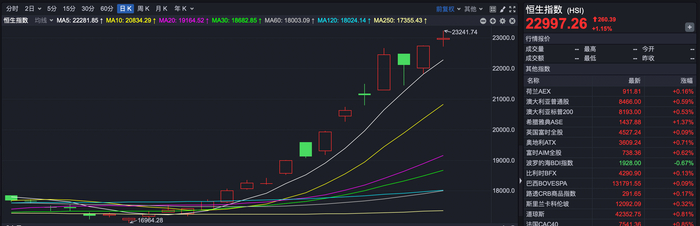 今日早间,恒生指数最高涨至23241点,涨幅达2.22%。尽管早盘一度冲高回落,但上午休市前,恒指涨幅依旧超过1%,创出阶段新高。