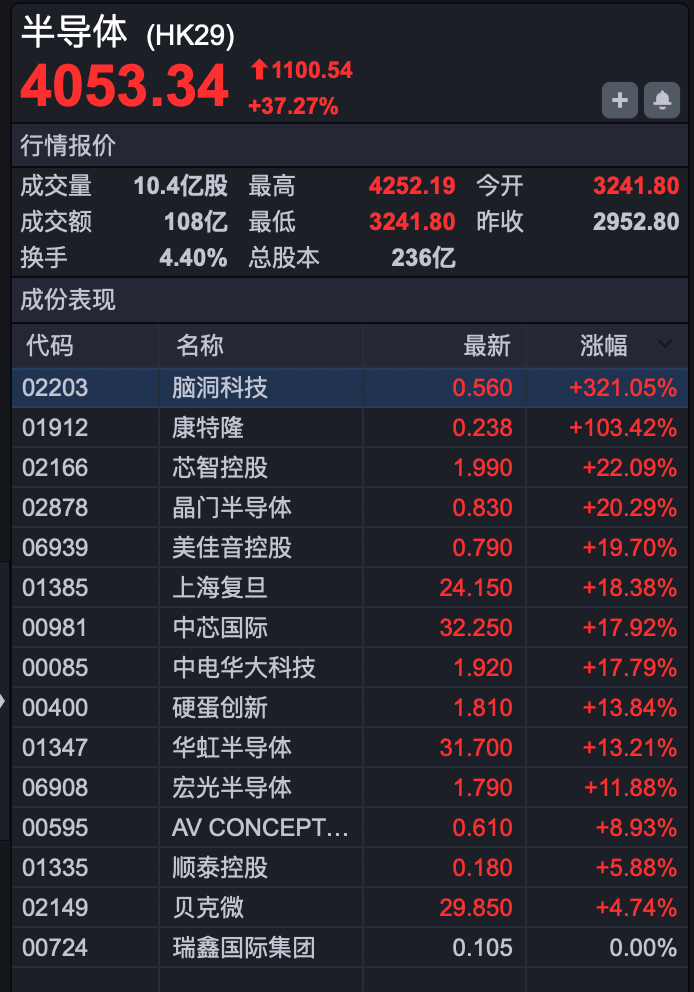 此外,港股半导体板块全线大涨。康特隆涨近100%,晶门半导体、芯智控股涨超20%。