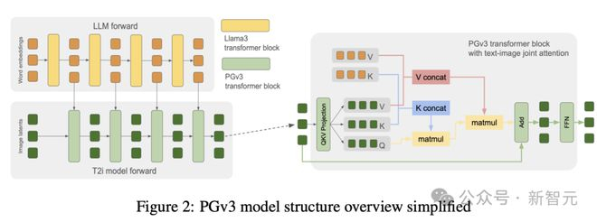 PGv3采用了DiT风格的模型结构,图像模型中的每个Transformer块都设置得与语言模型(Llama3-8B)中的对应块相同,仅包含一个注意力层和一个前馈层,参数也相同,如隐藏维度大小、注意力头的数量和注意力头的维度,并且只训练了图像模型部分。