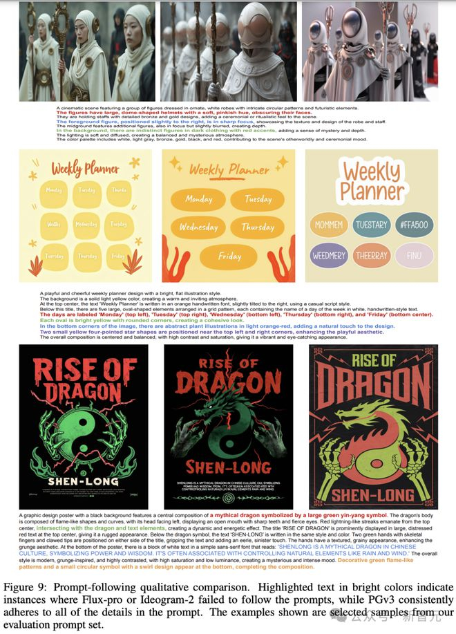 彩色文本代表模型未能捕捉到的具体细节,可以看到PGv3始终能够遵循细节。随着测试提示变长,并包含更多详细信息时,PGv3的优势变得尤为明显,研究人员将这种性能提升归功于我们集成了大型语言模型(LLM)的模型结构和先进的视觉-语言模型(VLM)图像描述系统。
