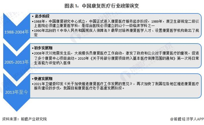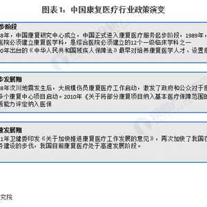 上世纪90年代初,我国颁布的《中华人民共和国残疾人保障法》中最早对培养康复医学人才、设置康复医学机构做出了规定,我国康复医疗行业开始起步发展;2008年汶川地震后,大规模康复医疗工作的启动加深了我国民众与政府对康复医疗的重视,随后在2010年《关于将部分康复项目纳入基本医疗保障范围的通知》第一次将日常生活能力这一康复医疗服务纳入医保;疫情期间,我国再度加深了对疾病后康复医疗重要性的认知,2021年10月卫健委颁布了《关于印发加快推进康复医疗工作发展意见的通知》加速推进全国各地区康复医疗设施建设。目前我国康复医疗行业仍处于高速发展阶段。