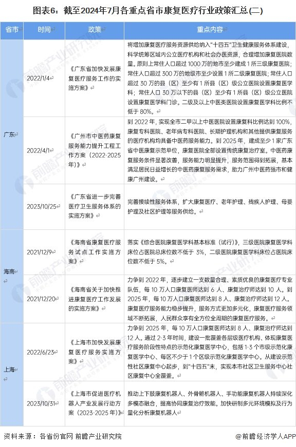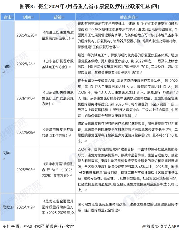 为了响应国家号召,各省市积极印发有关政策通知推动康复医疗行业的发展。截至2024年7月,各重点省市康复医疗行业的相关政策汇总如下: