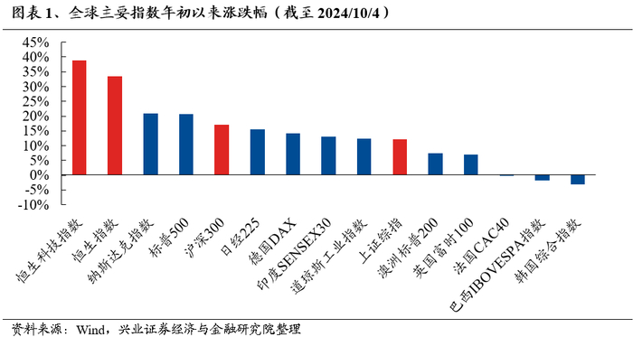 “抓住重点、主动作为” 的政策新导向下,市场逻辑已经反转。此前基本面转弱+政策“不作为”的悲观预期,导致市场持续回调。而9月24日以来连续的“政策组合拳”密集落地之下,市场风险偏好快速修复。9月底的逼空式反弹后,中国资产特别是港股2024年的涨幅已在全球领先。而十一假期期间,港股继续大涨、领跑全球。