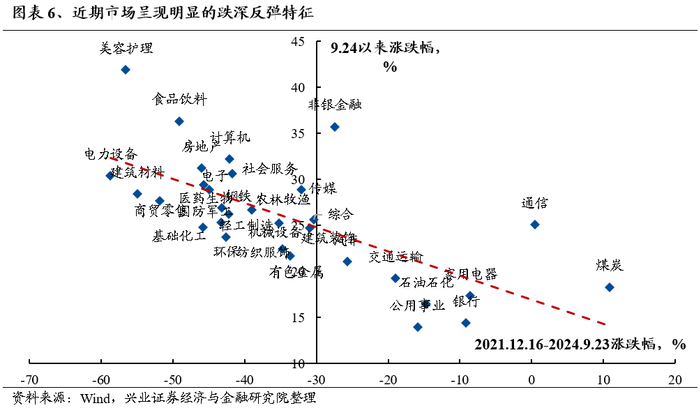 1)9月末货币工具创新及政治局会议对地产的表态均大幅超出市场预期。在货币政策端,此轮广泛降息在历史上非常少见,同时央行推出的抵押品互换便利工具以及股票回购、增持专项再贷款明显超出了市场预期,被投资者广泛理解为央行提供了针对股票市场的看跌期权保护,使得投资者对市场底的预期更加坚定。此外,政治局会议极为罕见地在9月分析和研究经济形势,反映出决策层对于加大宏观调控力度、加强逆周期调节的重视。其中,会议首次提出了促进房地产市场“止跌回稳”,这是继去年7月政治局会议调整对房地产定位后首次明确政策目标,同时首次明确减少供给也应当作为调控手段之一。
