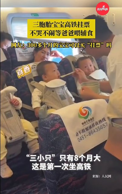 据悉,视频中的“三小只”仅8个月大,这是他们第一次坐高铁。网友们纷纷评论:300多个月的宝宝可以买“挂票”吗?