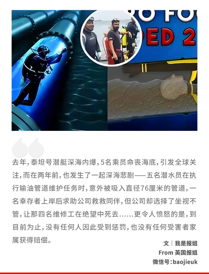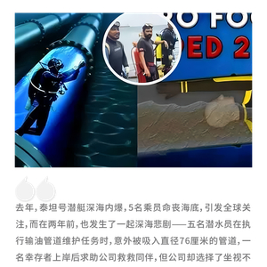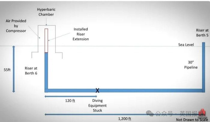 2022年2月25日,五名潜水员在执行输油管道维护任务时,意外被吸入直径76厘米的管道。