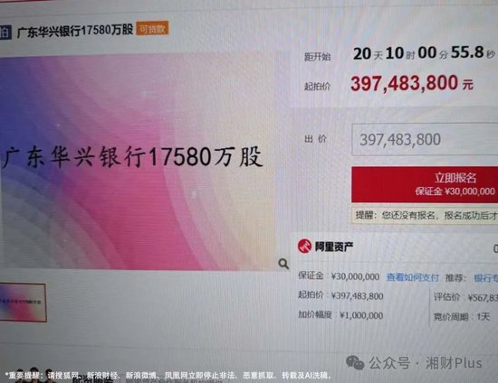 继第二大股东持股被多次拍卖之后,广东华兴银行第三大股东持股也被挂上拍卖平台,估值5.68亿元的股份折价30%,以不到4亿元起拍,单价远低于每股净资产。湘财Plus注意到,华兴银行第二大股东、第三大股东均为旧改大佬,近两年相继陷入资金危机,债务官司缠身。
