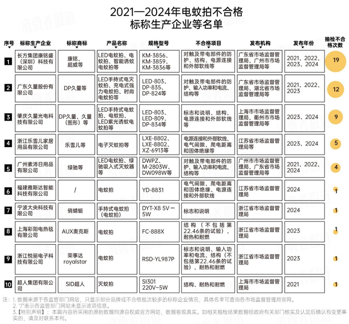 结果显示,2021年1月-2024年6月期间,监管部门共抽检893批次灭蚊灯、电蚊拍产品,其中477批次不合格,涉及超威、久量、康铭、超人、绿驰等标称品牌,主要不合格项目为结构、标志和说明、对触及带电部件的防护等。