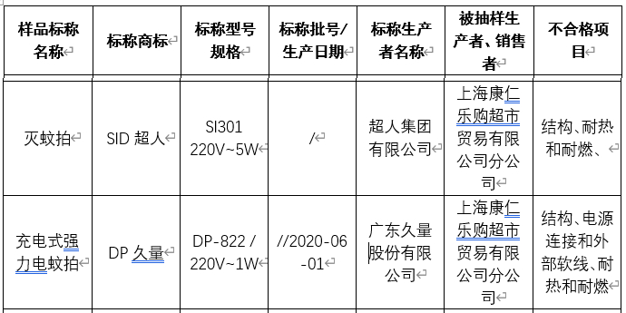 2021年7月,上海市市场监督管理局发布2021年上海市产品质量监督抽查结果,1批次标称由“超人集团有限公司”生产的“SID超人”灭蚊拍不合格,不合格项目为结构、耐热和耐燃。1批次标称由“广东久量股份有限公司”生产的“DP久量”充电式强力电蚊拍不合格,不合格项目为结构、电源连接和外部软线、耐热和耐燃。