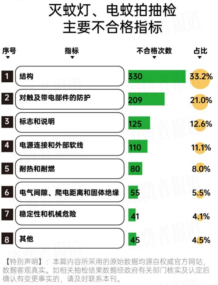 抽检中,灭蚊灯、电蚊拍的不合格指标较为集中,主要为结构、标志和说明、对触及带电部件的防护、电源连接和外部软线等。其中结构、对触及带电部件的防护不合格占比超过50%。