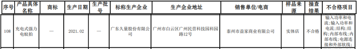 例如2023年4月,江苏省市场监督管理局发布关于2021年电冰箱等60种产品质量省级监督抽查情况的通报,1批次标称由“广东久量股份有限公司”生产的充电式强力电蚊拍不合格,输入功率和电流、结构、内部布线、电源连接和外部软线等。