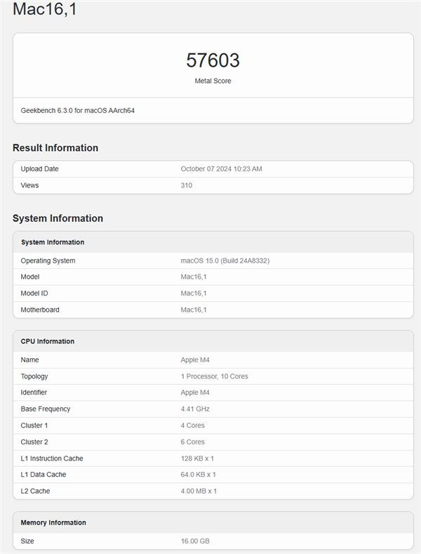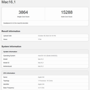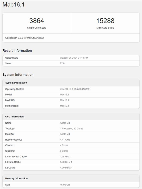 据了解,M4 Mac的Geekbench跑分成绩为单核分数3864分,多核分数15288分,这一成绩是在名为"Mac16,1"的测试机型上获得的,该机型搭载了10核CPU。