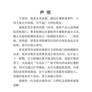 声明还提到,由于赶上十一假期,官方检测结果不能及时出来。雨姐不想再等了,凡是通过“东北雨姐”账号售出的该款红薯粉条,均可以通过订单链接,先行全额退款处理。